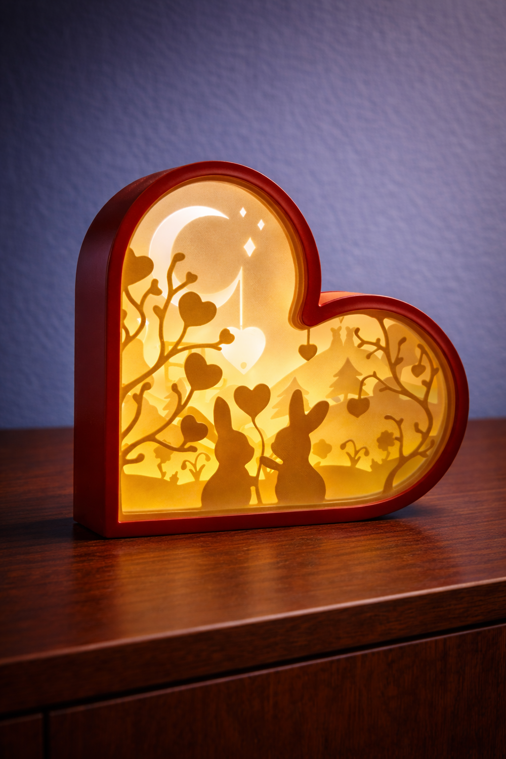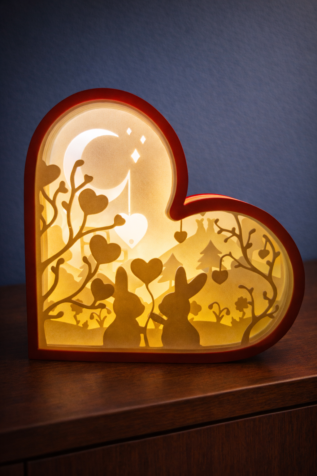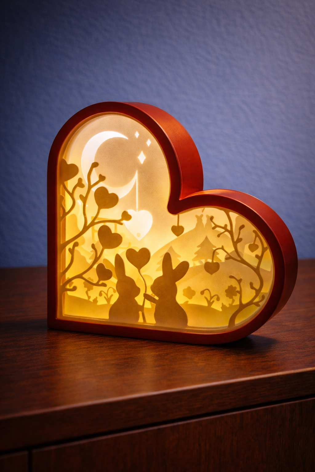 Een schadowbox met verliefde konijnen in de natuur. geeft licht in het donker doormiddel van de lichtjes erin. ideaal als decoratie in huis en als cadeau voor uw partner